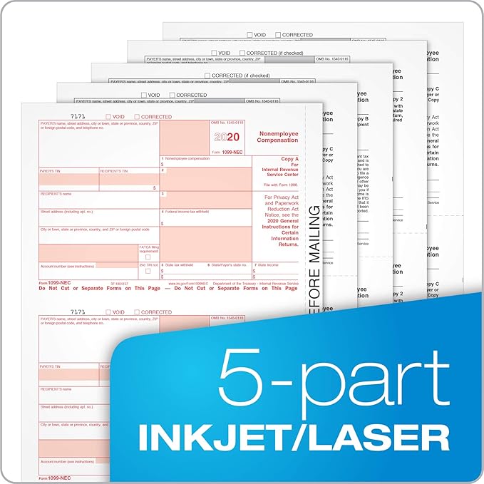 Amazon Com Adams 1099 Nec Forms 2020 5 Part Laser 1099 Forms With Self Seal 1099 Envelopes For 50 Recipients Includes 3 1096 Forms White Txa2250e Nec20 8 1 2 X 11 Office Products